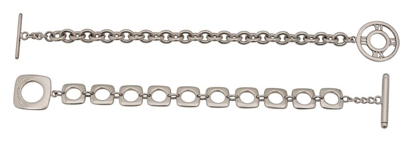 the first the Atlas toggle bracelet marked 'Atlas 2003 Tiffany & Co. 925', the second a square cushion link toggle bracelet marked 'Tiffany & Co. 925'