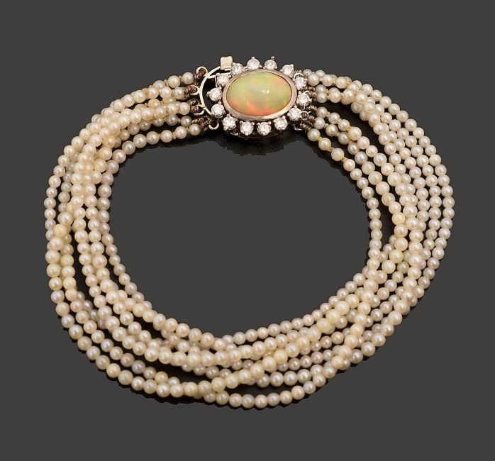 the seven row seed pearl bracelet to the oval opal cabochon and diamond-set cluster clasp