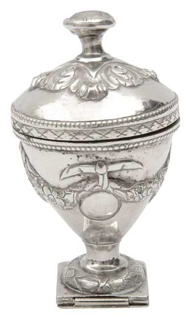 of urn form embossed with garlands, the hinged domed cover with rock crystal set finial, on a square pedestal foot with hinged compartment, prick engraved to foot AJDE 1800, gilt interior