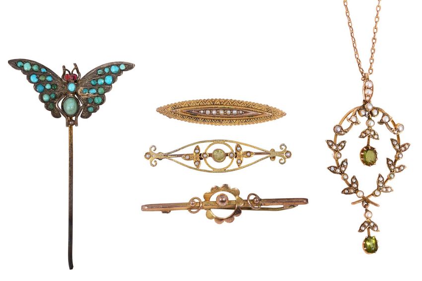 An Edwardian half pearl and peridot pendant on chainof openwork garland design, the loop stamped '9CT', suspended from an oval link chain necklace, the clasp stamped '9CT' ; three brooches each stamped '9ct' or hallmarked as such; and turquoise-set butterfly stick pinpendant length including loop 5.2cm, combined gross weight of 9ct items 11.7gCondition: