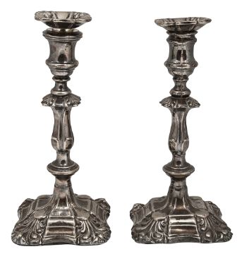 A pair of early Victorian silver plated candlesticks in George II style