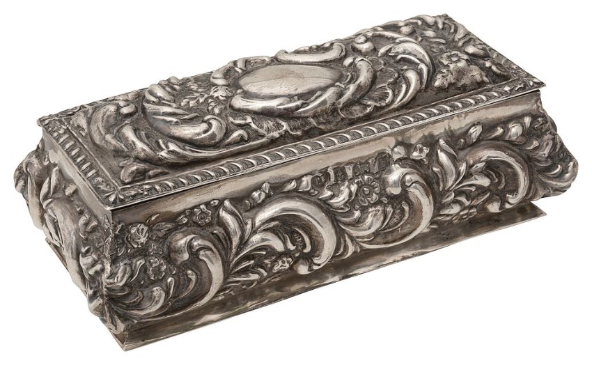 rectangular bombe form, all over embossed with foliate scrolls and flowers, hinged domed lid with vacant cartouche and gadrooned border, interior lined in pale blue silk