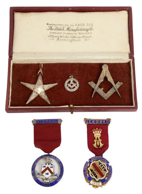first of pentagonal pyramid form, opening to form a five pointed star engraved with various symbols, stamped Reg. 68230, together with a silver-gilt compass and set square collar jewel, a silver circular fob pierced with compass and set square and two silver-gilt Royal Masonic Benevolent Institution Stewards Jewels, for 1930 and 1935, (5)