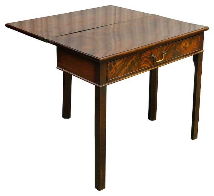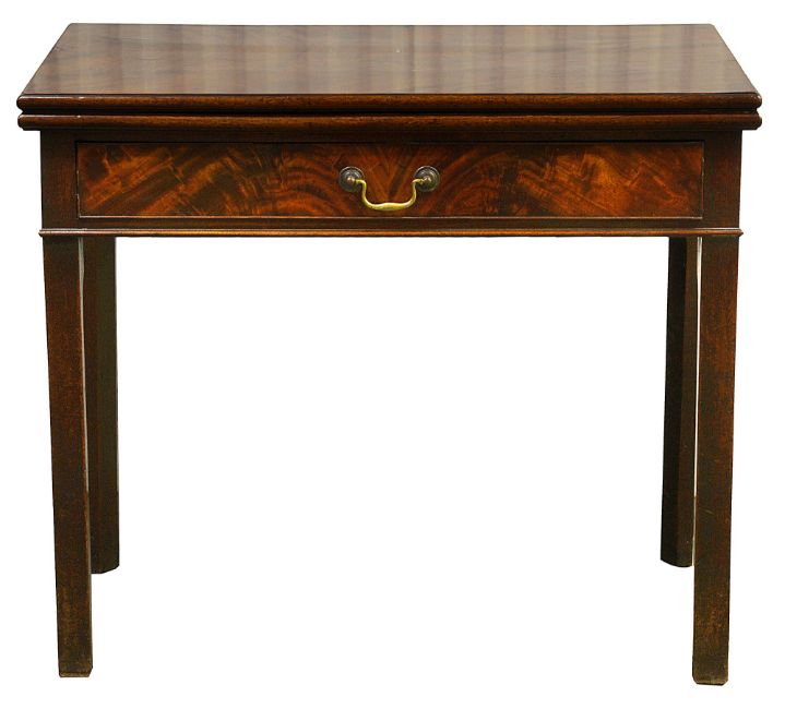 the flame mahogany foldover top above a long drawer, on chamfered legs