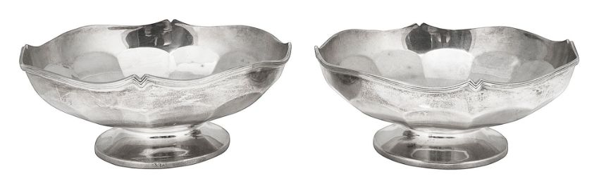 of shallow circular panelled form with wavy edged reeded rims, on circular spreading feet, bases stamped, 'Rd611050', (2)
