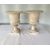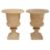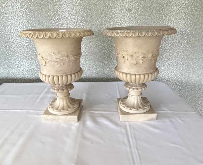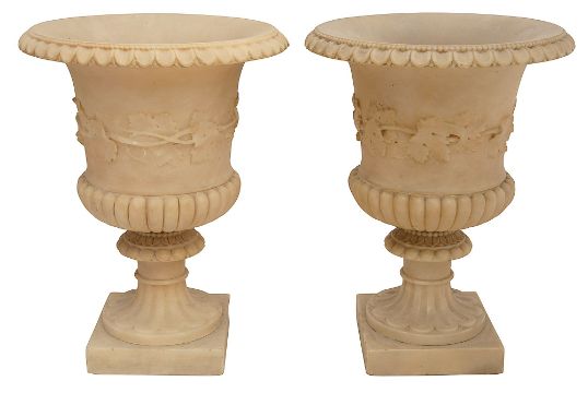 of half gadrooned campana form with everted beaded and moulded rims, carved fruiting vine collar, on a fluted socle and square base, (2)