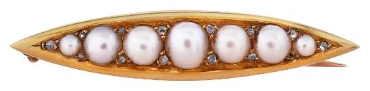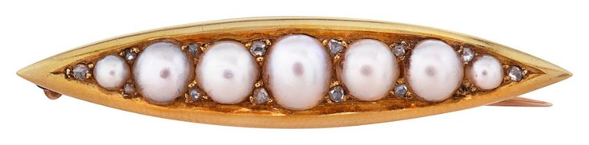 designed as a stylised pea and set with a graduated line of half pearls with diamond points between, yellow gold closed back setting, safety chain, the case dated '14th Sep 1892'