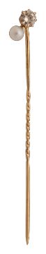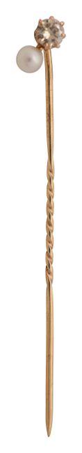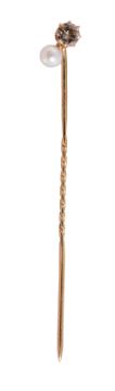 A light cinnamon coloured diamond and cultured pearl stick pin