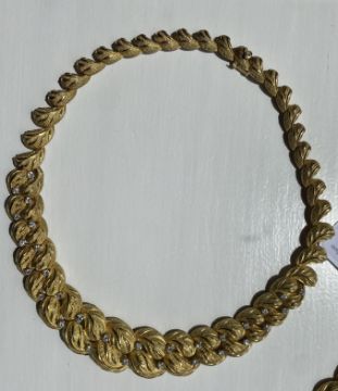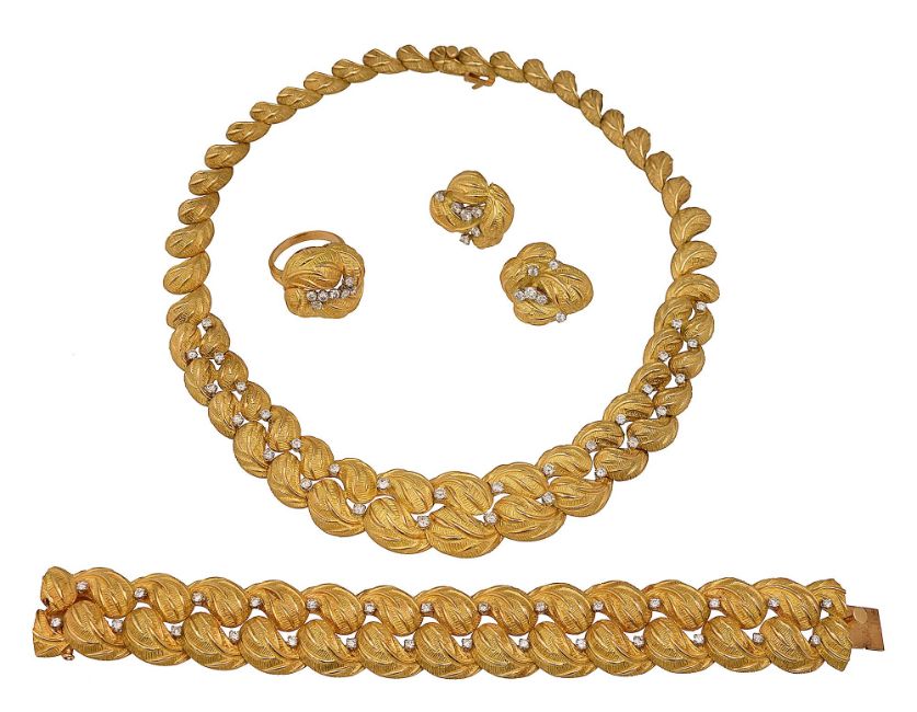 comprising a graduated necklace, a bracelet, a pair of earrings and a ring, each of plain and textured foliate design with brilliant-cut diamonds between, stamped with French control marks for gold and platinum and maker's poincon 'RT'