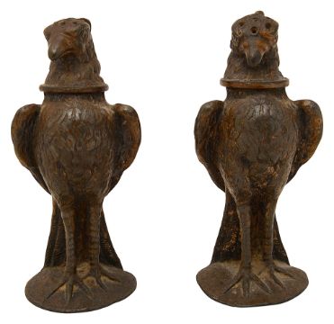 A pair of late 19th century novelty cold painted pewter Phoenix pepperettes