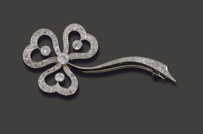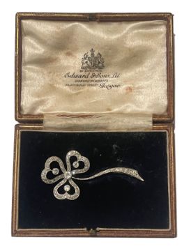 A diamond-set foliate spray brooch, designed as a three leafed clover and collet-set with four brilliant-cut diamond within a single-cut diamond surround, similarly-set curving stem, contemporary leather and gilt tooled and fitted case