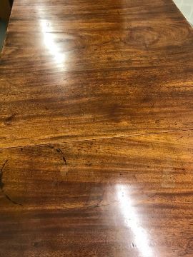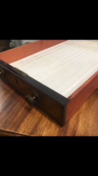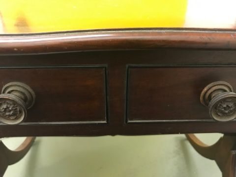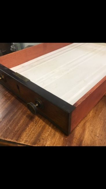 Condition: There is some shrinkage to the top on both sides which has caused unevenness, see image. The top has old marks and ring marks. The drawers have been relined and are an orange colour.