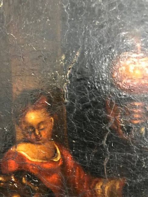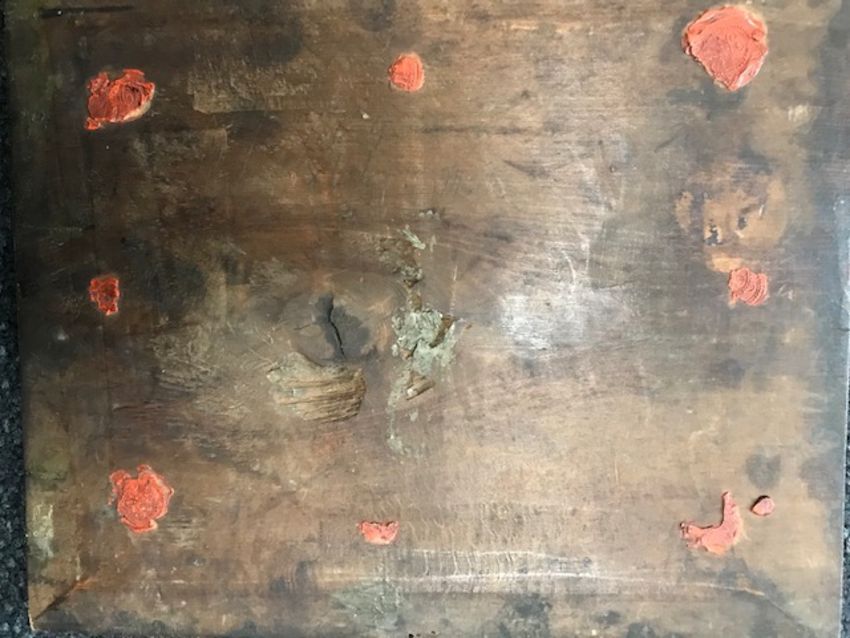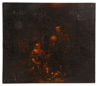 Condition: The paint to the panel is crazed throughout and where there is a knot in the wood, above the seated child's head, there is a crack and paint has lifted. The back has various red seals, one monogrammed 'J&H'. The rear of panel chamfered