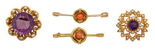 a Victorian 9ct yellow gold, amethyst and seed pearl brooch; and two coral and yellow gold bar brooches, (4)