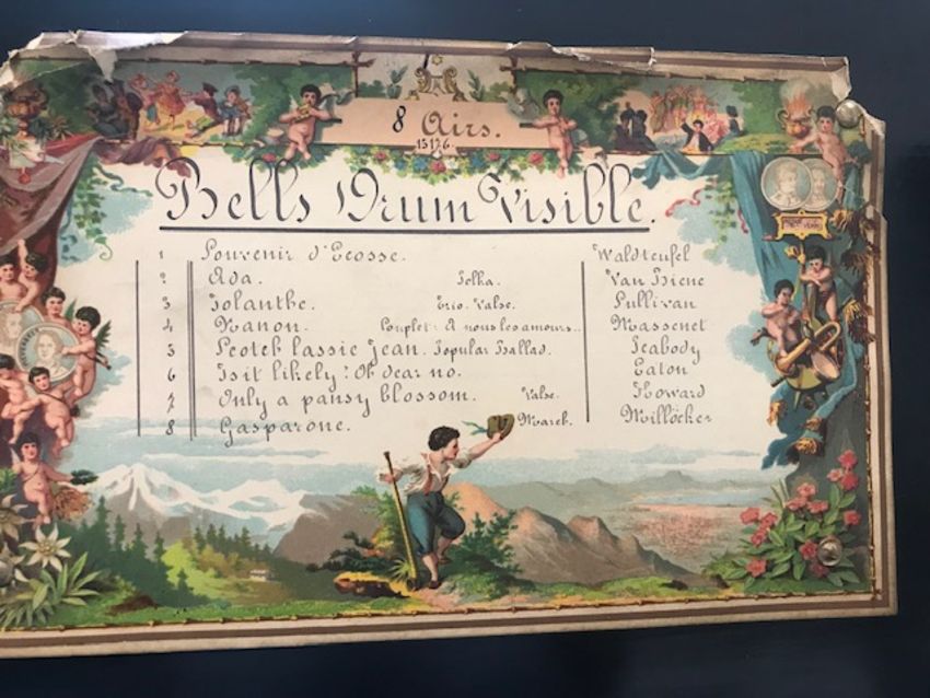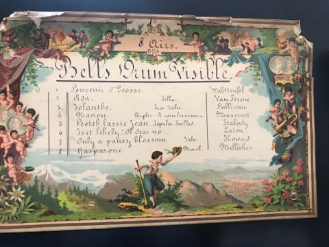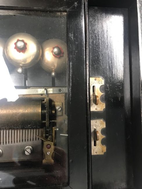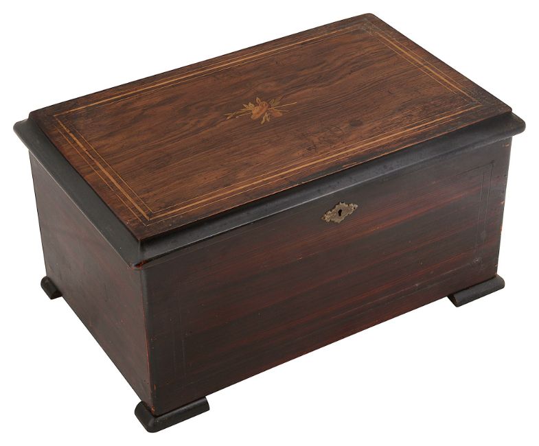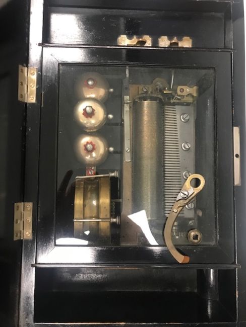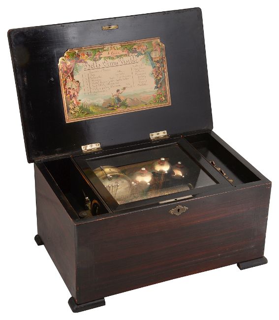 A Swiss bells and drum-in-sight cylinder musical boxcirca 1880the 15cm cylinder playing eight airs accompanied by a drum and three bells as listed on a tune sheet with three bells and a 15cm brass cylinder with a ratchet handlewidth 42cm, depth 27cmCondition: We cannot guarantee the mechanism. The case is in reasonable houseworn condition. There is a small stringing section missing to the lid and the left rear corner of the lid has a small amount of old timber loss, 11cm. Some old wormholes to lower left corner.