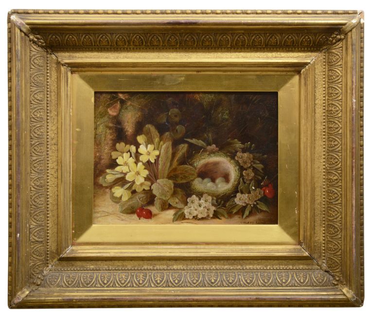 ÔA bird nest in a woodland settingÕ, oil on canvas, framed,