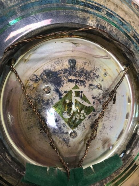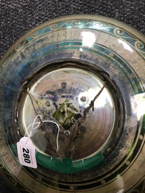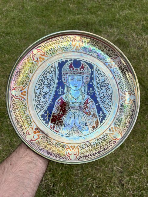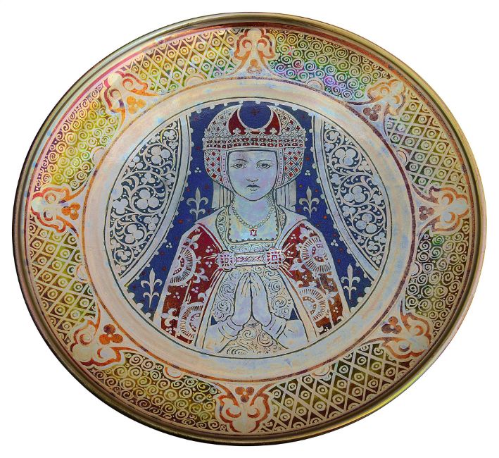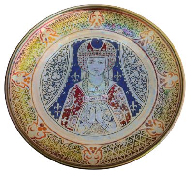 glazed lustre earthenware, painted in gold, blue and red with a medieval woman praying within a lozenge patterned border, rear with artist's monogram 'RJ 1922' and indistinctly impressed with maker's mark