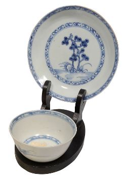 An 18th century Chinese export Nanking Cargo blue and white porcelain tea bowl and saucer c. 1750