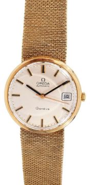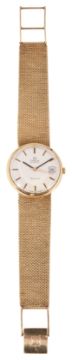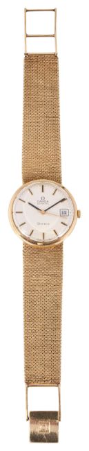 circular matte silver dial with raised gold and black hour batons and minute markers, calendar aperture at 3 o'clock, back baton hands a gold centre sweep seconds, caseback with presentation inscription, 9ct textured mesh strap bracelet with fold over clasp with Omega emblem, accompanied by original receipt dated 1980, in original box
