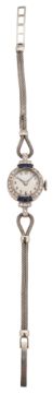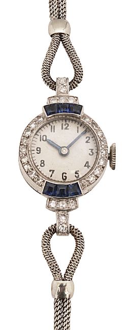 the circular dial with Arabic numerals to the bezel and lugs set with single-cut diamonds and calibrŽ-cut sapphires(possibly synthetic), the case stamped ' PLATINUM' to the associated double mesh strap bracelet and deployant clasp stamped '9ct'