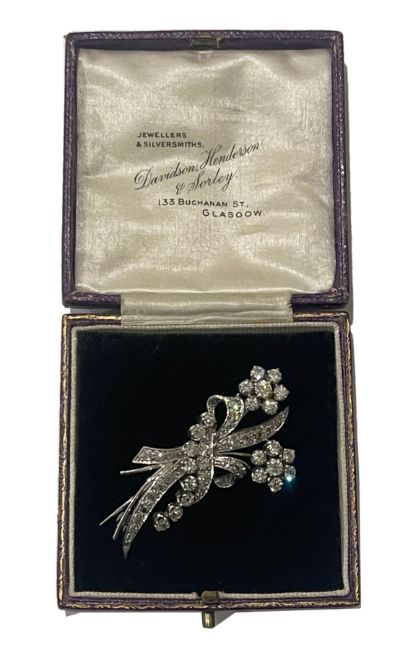A diamond-set floral spray brooch, the two flowerhead clusters and elaborate ribbon bow set with brilliant-cut diamonds, case for Davidson, Henderson and Sorley, Glasgow