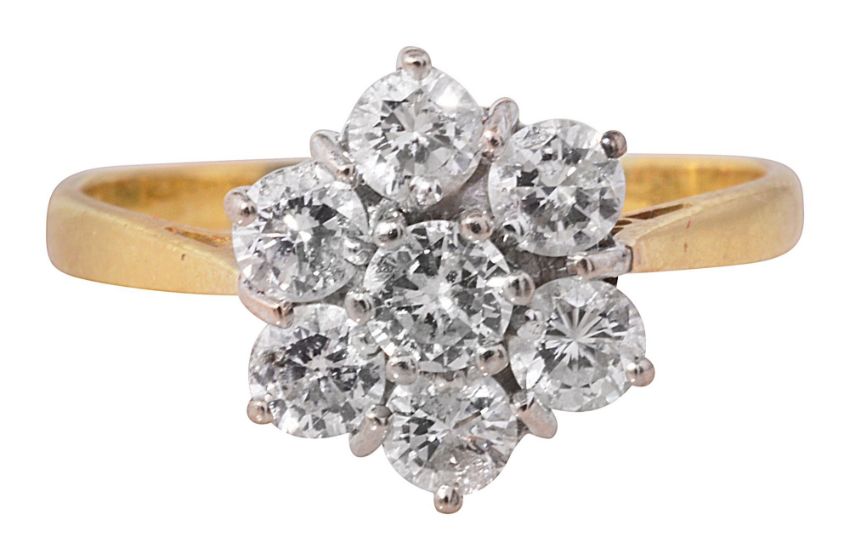 A diamond-set cluster ring the flowerhead design set with seven brilliant-cut diamonds to the 18ct yellow gold plain tapering shank, London hallmarkring size O, 3.4gCondition: Overall condition very good. Diamonds each spread circa 0.10cts, VS/SI clarity, I/J colour