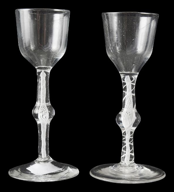 with ogee shaped bowls raised on central knopped stems, one double series with a central gauze and a pair of outer tapes, the other single central gauze stem, on conical feet, (2)
