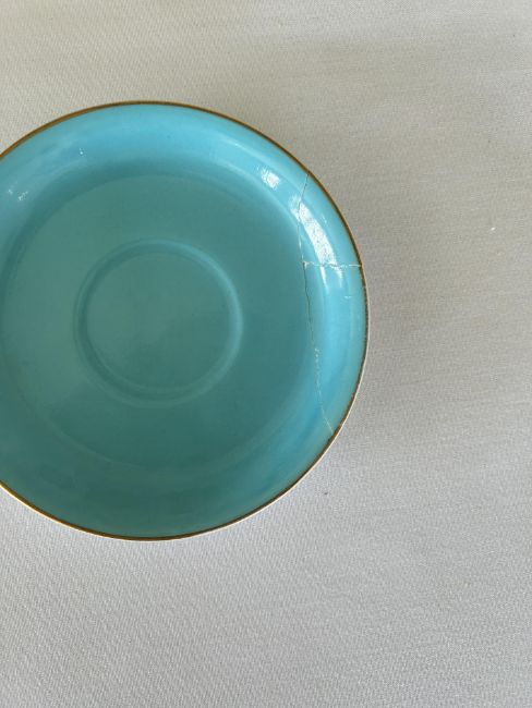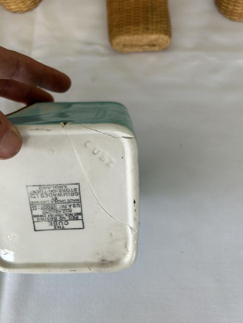 Condition. Cube teapot has been damaged and repaired, one saucer has also been damaged and repaired, one plate hairlined, tea cup hairlined. One beaker with chip and hairline, the other hairlined. One handle missing from case. tear to rexine