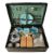 black rexine covered case with fitted interior containing a blue The Cube teapot, and four matching plates, two beakers, a tea cup, four saucers, two jars, pepper pot and covered pot, kettle, sandwich tin, another tin,, spirit cannister, cane wrapped tea and sugar cannisters, pair of square bottles and a flask, and a four piece cutlery set