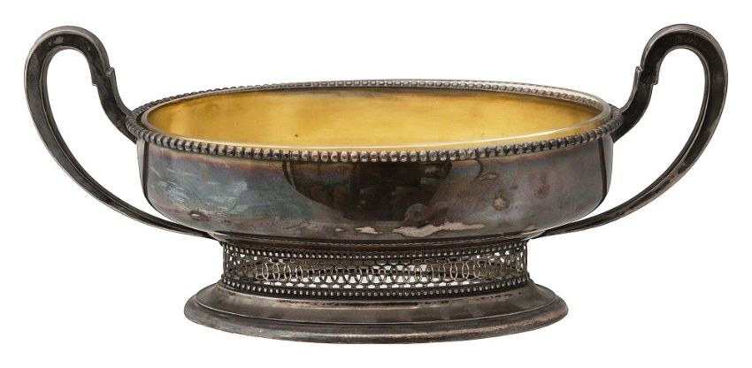 of plain elongated oval form with beaded rim, interior gilt and fitted with clear glass liner, on a pierced pierced pedestal and a spreading foot