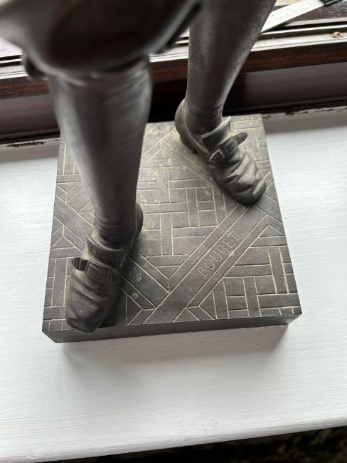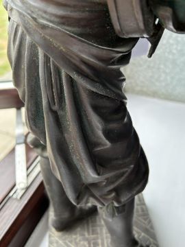 Condition: corrosion principally to the rear of the bronze on legs plinth and folds of clothing. Screw hole to right leg lacking pin. Slight rock to base