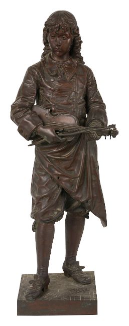 holding a violin, and standing on a parquet floor, square base signed Bouret