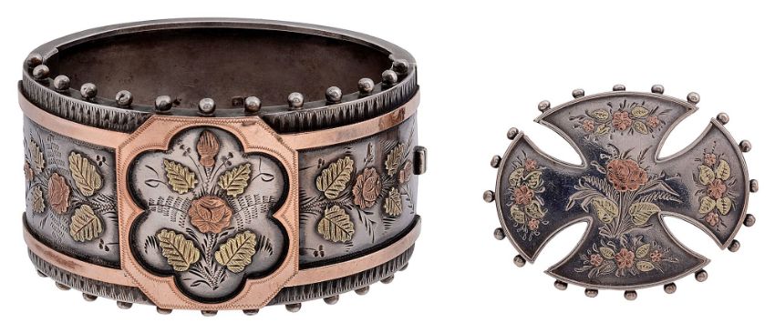 applied two-coloured floral and foliate motifs with chased abstract design and chased floral and foliate details together with a matching brooch with similar design, both stamped (2)