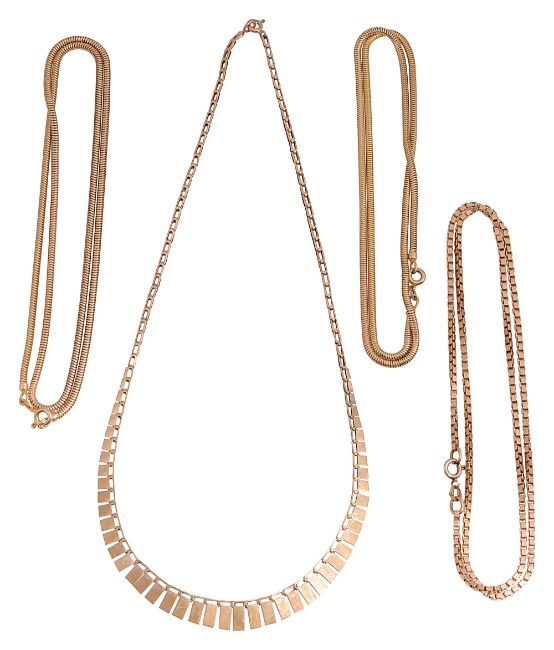 9ct gold boxlink chain, stamped to tag '375'; 9ct gold snake link chain, stamped to tag '375'; another 9ct gold snake link chain and 9ct gold fringe necklace, of graduating design, stamped '375' to clasp