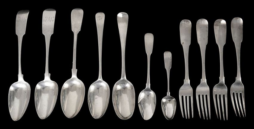 first Dublin, 1808, makers mark J.K. initialled, together with three fiddle pattern table forks, Dublin, 1829, William Ward, a near matching fork, all crested with a Phoenix, a pair of fiddle pattern tablespoons, Dublin, an Old English pattern tablespoon, Dublin, 1783, John Laughlin Senior, crested, etc., (qty)