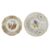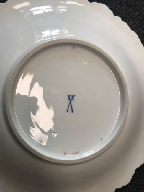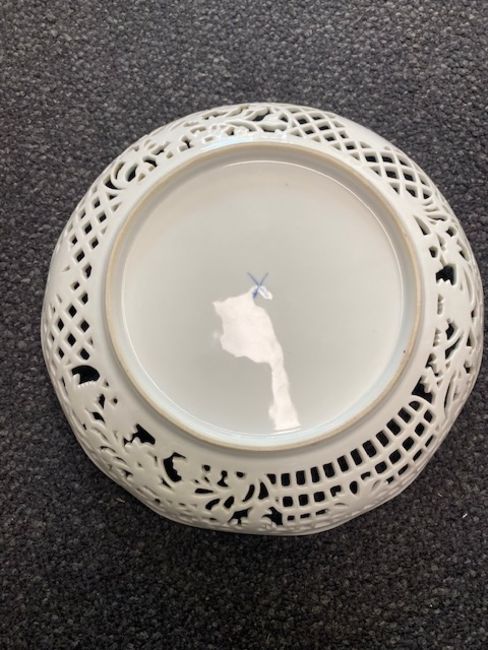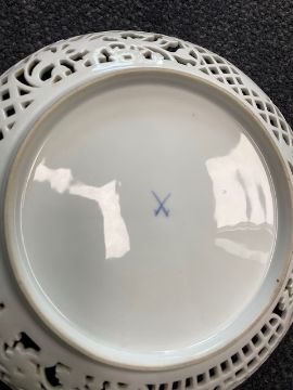 gilt decorated and with three rocaille cartouches with flowers and fruit, the centre with grapes and a lemon, underside with blue crossed swords mark, twice impressed with numerals and painted shape mark, '154 h 69', the Dresden plate with gilt decoration and a reticulated border enclosing an 18th century courting couple, blue crossed swords mark (2)