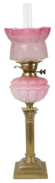 with a chimney and frosted shade with waved edge and etched with flowering vases, the brass burner above a moulded pink glass reservoir, on a brass Corinthian column and stepped weighted plinth base