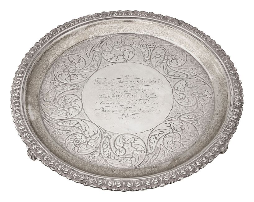 circular with raised moulded border and leaf border, engraved Jun Esq, Their Secretary in Acknowledgement of his Services and in Testimony of their Regards April XIII MDCCXXXVI, within scrolling foliate border, on three acanthus paw feet