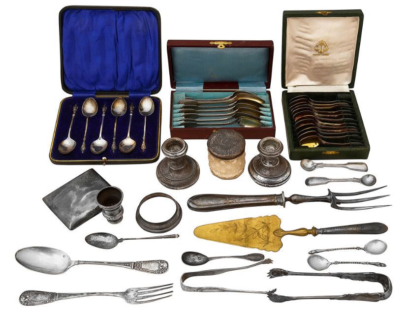 Condition: Most items in good condition. candlesticks have repairs, filled handle of serving slice a/f. Cigarette case lid of jar knocked and dented