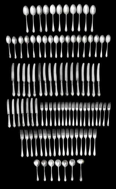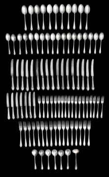comprising eighteen table forks, eighteen dessert forks, eighteen dessert spoons, six soup spoons, eleven tablespoons, a sauce ladle, seventeen table knives and seven dessert knives, both with stainless steel blades (qty)