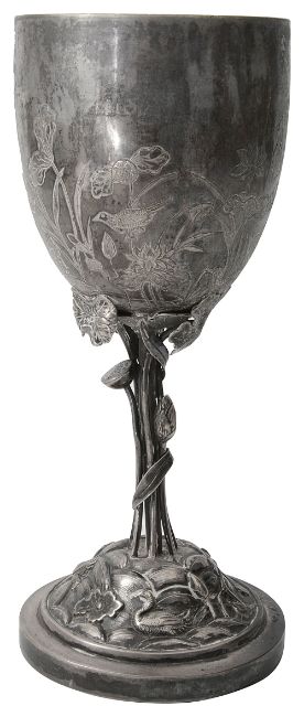 A late 19th century Chinese export silver gobletstamped Wang Hing 90, artisan marks,the urn shaped bowl finely chase with birds, lotus blooms and foliage, supported on a naturalistic stem formed of gathered lotus leaves, on domed circular foot with conforming repousse decorationheight 21.1cm., weight approx. 9.01oztCondition: