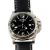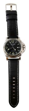 circular black striped dial with luminous hour batons and Arabic numerals 12, 6 and 9 and minute markers, magnified date aperture at 3, luminous hands, centre sweep seconds and GMT hand, twenty four hour bezel, black leather bracelet , associated box