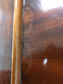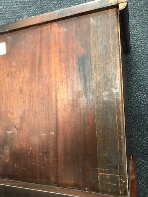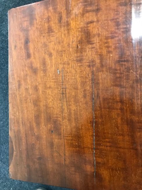 Condition: In good restored condition overall. The top with splits and a small repair. Two old veneer repairs to base of right side. Side return moulding to upper left side is later, one later section to its back. Each drawer with a lock, no key.