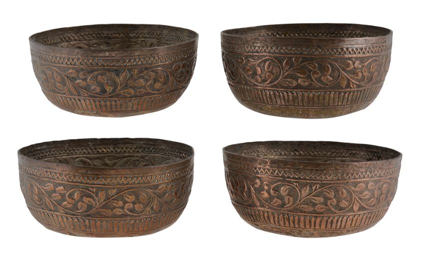 repousse decorated with scroling foliate decoration, the underside with a roundel containing a crossed Kris and scabbard, (4)