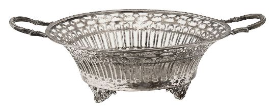 of circular tapering form with pierced sides and gadrooned rim and c scroll handles, on pierced foliate bracket feet