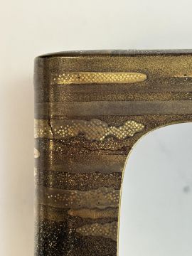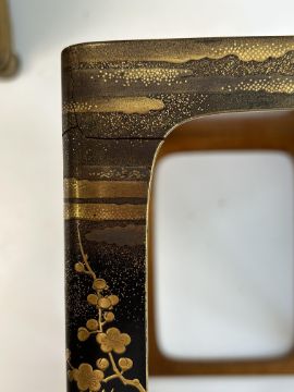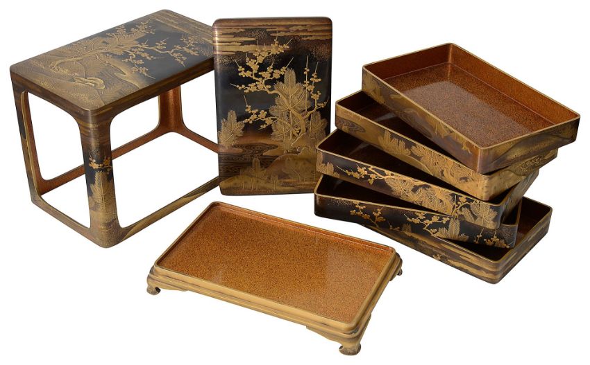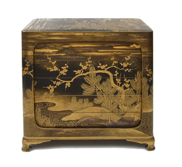 the four tiered rectangular box with a black lacquer roiro ground decorated in gold takamaki-e, togidashi maki-e, and kirikane with a river landscape with pine trees, flowering prunus and clouds, interior of nashiji, the cover similarly decorated, on a stand raised on ogee bracket feet