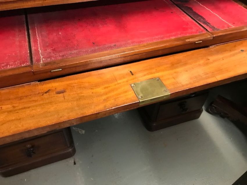 Condition: In good houseworn condition overall with some old marks and scratches and a few splits in places. The top has a later removable rear gallery. There are some mouldings lacking and some are detached but present. The locks stamped Bramah.