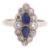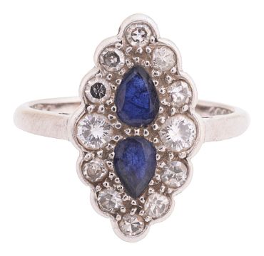 the navette-shaped cluster centrally-set with two addorsed pear-shaped sapphires to the border of brilliant-cut and single-cut diamonds, the plain shank stamped '18CT PLAT'