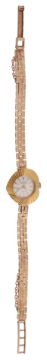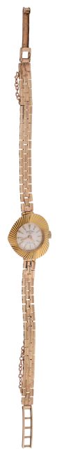 with champagne dial, baton numerals and heart shaped case to an integral 9ct gold flexible link bracelet stamped to clasp '9.375' and safety chain
