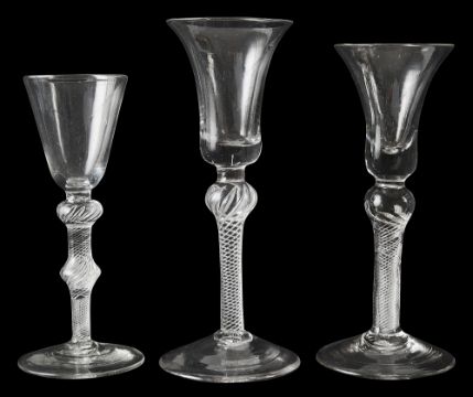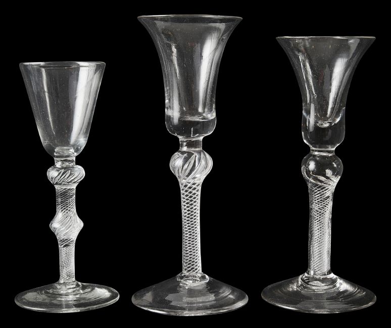 first bell shaped bowl on a multi spiral stem with shoulder knop, second round funnel bowl on a multi spiral stem with shoudler and central knops, third bell shaped bowl on a multi spiral stem with shoulder knop, on conical feet, (3)